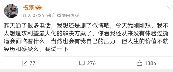然而,8月20日晚,杨颜最终决定删除相关微博,并表示不想继续撕逼,希望以更平和的方式解决问题。