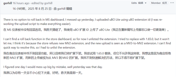 Raymond Hill表示:"我在重新编写上传脚本时犯了错。我在微软的扩展商店后台没有找到回滚功能,所以暂时将扩展程序下架了。我尝试用1.65.0版本替换,但商店不允许,可能是因为商店拒绝新的MV2扩展,而新的上传被视为从MV3到MV2的转换。我没有找到快速解决的方法,所以不得不将扩展下架。"
