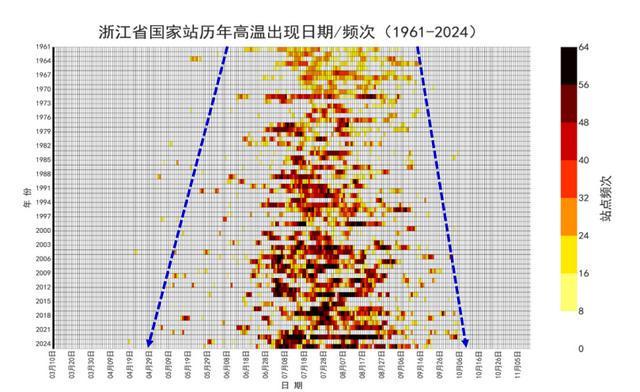 浙江省65个国家气象站高温出现日期&站数统计(数据来源:浙江省气候中心)
