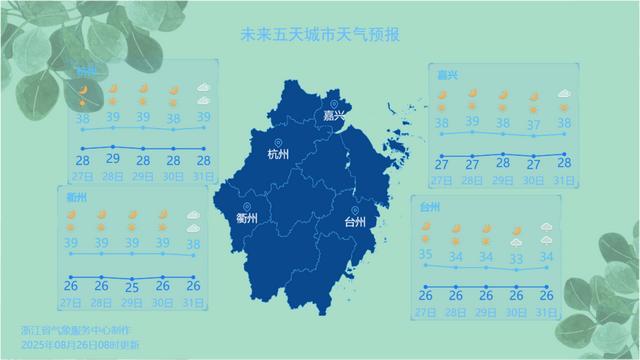 昨天的午后强对流天气给杭州带来了短暂的降温,今天早晨杭州最低气温25.9℃,但是在副热带高压的控制下,预计今天最高气温38℃左右。杭州市气象台2025年08月26日09时15分发布主城区高温橙色预警信号:受副热带高压控制,预计今天上城区、拱墅区、西湖区和滨江区所有街道最高气温可达38℃左右,请注意做好防暑降温工作。