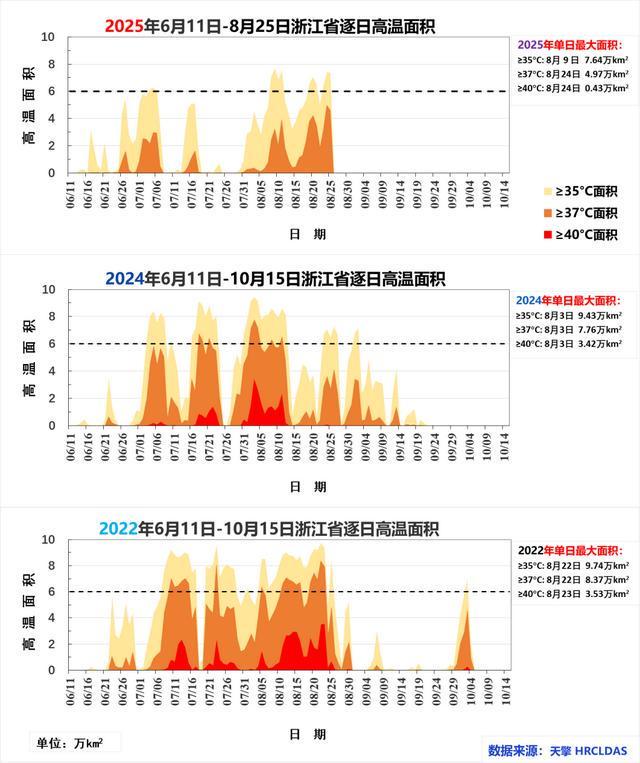 2025年全省逐日高温覆盖面积及其与 2022 年和2024年同期对比