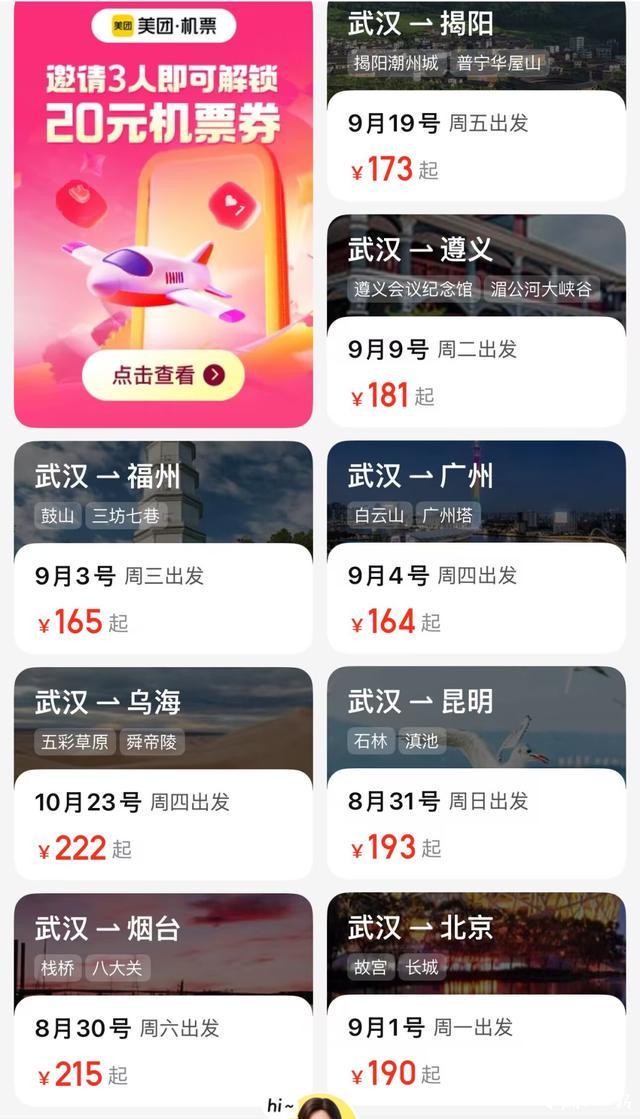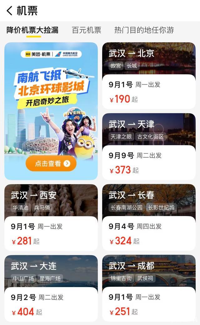 “每年9月都是出游的传统淡季,相较于旅游高峰时段,一部分热门航线甚至会打‘骨折’,为游客提供了高性价比的出行选择。”去哪儿大数据研究院相关负责人称,暑期结束迎来机票价格“洼地”,此时错峰出行,有机会“捡漏”。记者在机票订购软件上查询,武汉飞往广州、昆明、北京等地,机票价格最低只要一百多元。