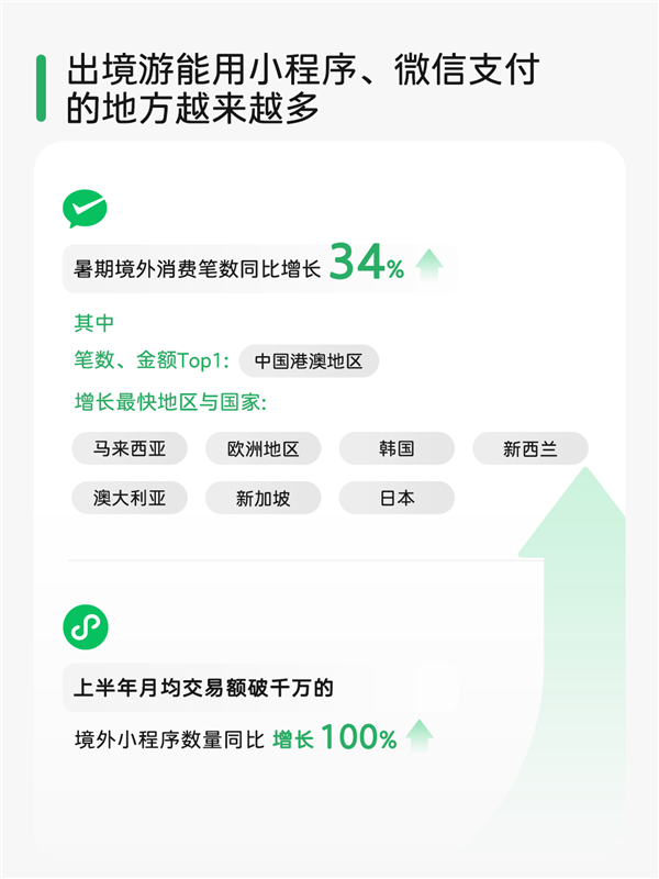 在出行与消费细节上,微信生态助力显著。暑期通过微信跨境支付的出行笔数同比增长82%,今年上半年活跃交通类小程序数量同比增幅40%,欧洲之星高铁等借助微信小程序打造符合中国用户习惯的数字化服务。
