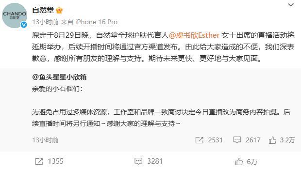 此外,自然堂官方账号发文:“原定于8月29日晚,自然堂全球护肤代言人虞书欣女士出席的直播活动将延期举办,后续开播时间将通过官方渠道发布。由此给大家造成的不便,我们深表歉意,感谢所有朋友的理解与支持。期待未来更快、更好地与大家见面。”