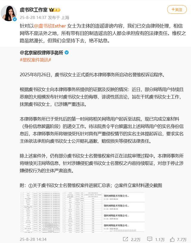 针对以虞书欣女士为主体的造谣诽谤内容,我们已交由律师处理,相信网络不是法外之地,所有带有目的制造谣言的人都会承担应有的法律责任。维权之路虽然漫长,但我们会坚持下去,绝不姑息。