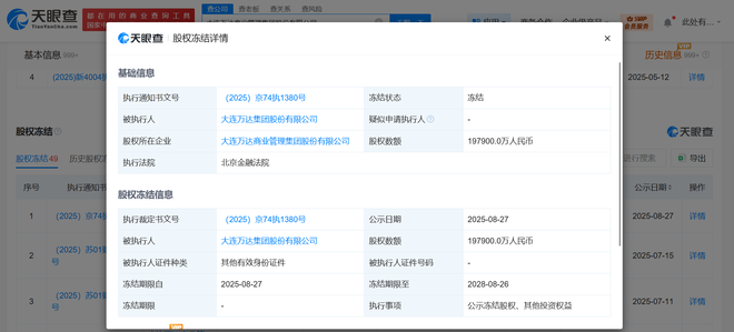 天眼查App显示,近日,大连万达集团股份有限公司新增一则股权冻结信息,股权所在企业为大连万达商业管理集团股份有限公司,冻结股权数额19.79亿人民币,冻结期限自2025年8月27日至2028年8月26日,执行法院为北京金融法院。