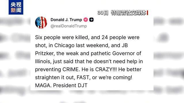 特朗普当天在其“真实社交”平台上发帖抨击伊利诺伊州州长普里茨克“软弱可悲”,称“芝加哥上周就有6人被杀、24人遭到枪击”,对方却声称“在预防犯罪方面不需要帮助”。特朗普再次发出威胁:“他最好迅速搞定事情,不然我们就要来了!”