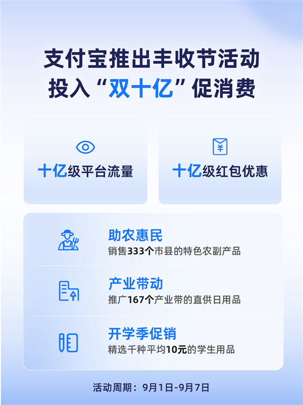 9月1日消息,支付宝正式启动"双十亿"活动,在金秋时节为广大消费者与商家带来满满福利。