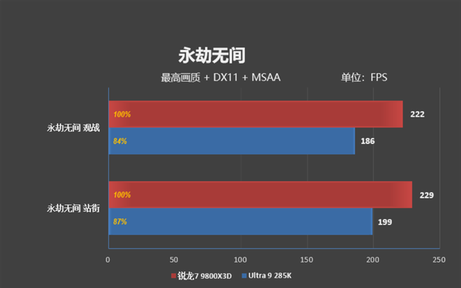 观战的时候,Ultra 9 285K是186FPS,锐龙7 9800X3D帧率是222FPS。