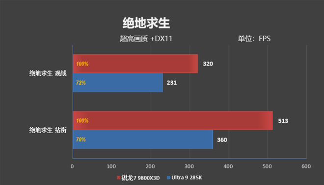 跳伞时,锐龙7 9800X3D的帧率是513FPS,Ultra 9 285K则是368FPS。