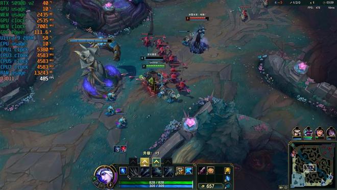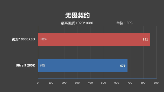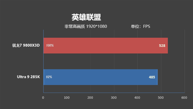 这是对线时的帧率,Ultra 9 285K是485FPS,锐龙7 9800X3D有528FPS,强了9%左右。