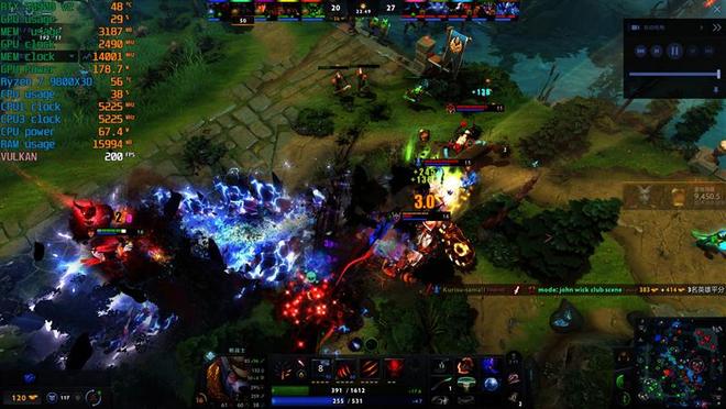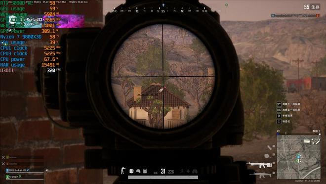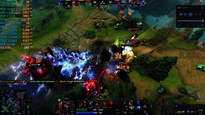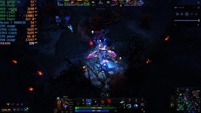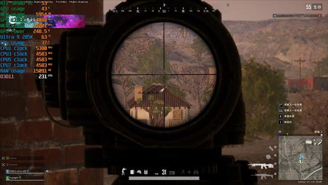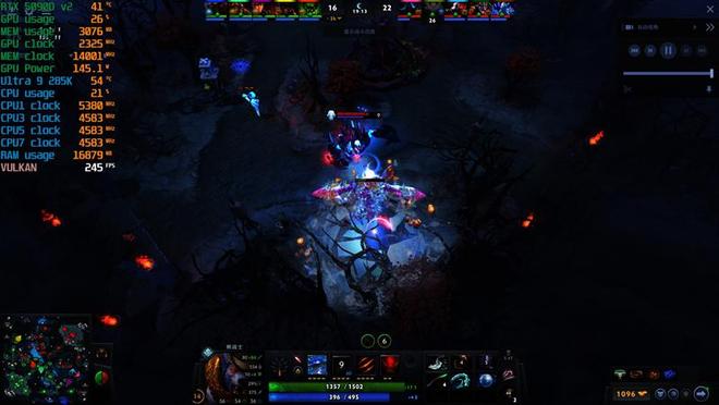 观战的时候,Ultra 9 285K帧率231FPS,锐龙7 9800X3D则是320FPS,高了89帧。
