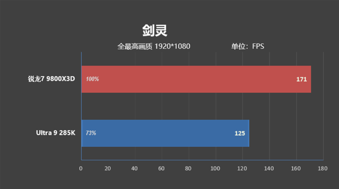 7个游戏12个测试项目,锐龙7 9800X3D在所有的项目中全都战胜了Ultra 9 285K,平均领先幅度达到了27%。