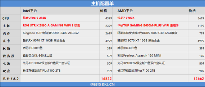 算下来,AMD平台预算是12660元,而Ultra 9 285K平台整套配置需要16800元,主要是Intel这边的处理器、主板和内存价格要明显高一些。