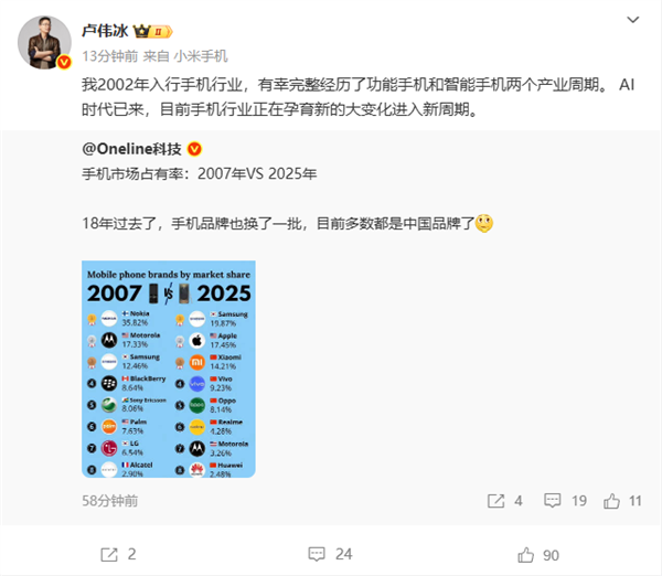 卢伟冰今天发文称:"我2002年入行手机行业,有幸完整经历了功能手机和智能手机两个产业周期。AI时代已来,目前手机行业正在孕育新的大变化进入新周期。"