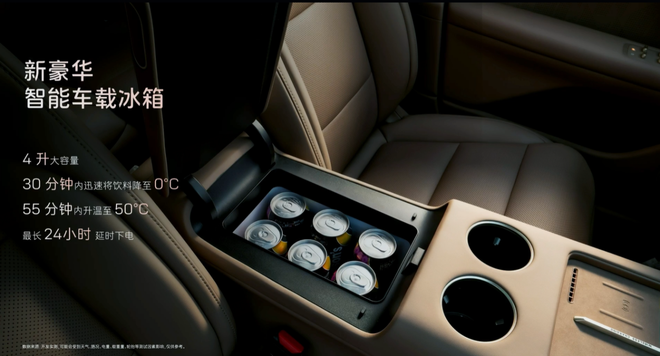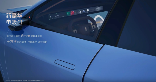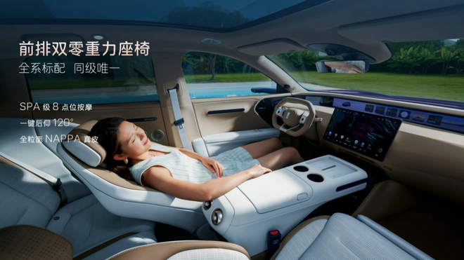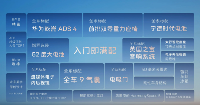 全系标配前排双零重力座椅、英国之宝音响、9个安全气囊带中间远端气囊、华为全维防碰撞系统CAS、电吸门、4升冷暖箱、流媒体内后视镜等配置,并提供电子外后视镜选装。