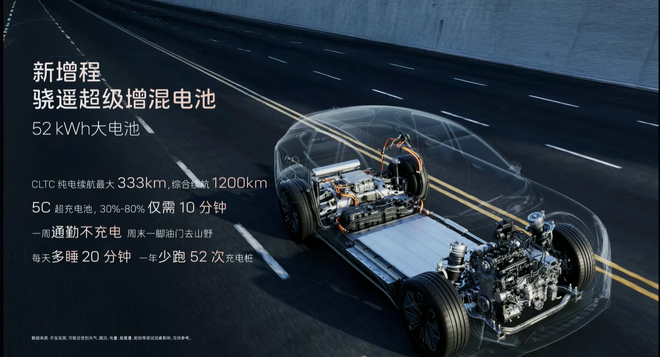 后驱车型保留现款的39.05kWh的电池,纯电续航195公里,比现款车型提升7公里。而新增的长续航电池搭载宁德时代提供的骁遥超级增混电池,容量为52.01kWh,CLTC纯电续航为333公里,综合续航1200公里,支持5C充电,30-80%充电仅为10分钟。