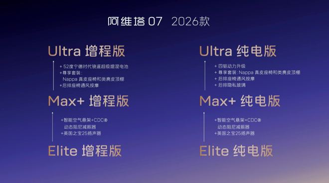 9月4日报道2026款阿维塔07正式开启预售,新车将会推出6款配置,目前官方并没有公布预售价格,推出2000元抵5000元的限时权益。新车最大亮点是增程版车型搭载52kWh的宁德时代骁遥超级增混电池,CLTC纯电续航最长达333公里。同时新增晴蓝车身颜色,岩棕内饰颜色、电吸门、冷暖冰箱、流媒体内后视镜、智驾小蓝灯、首搭鸿蒙座舱5和首搭华为乾崑智驾ADS 4,并且优化太行底盘。
