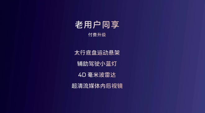 同时老用户可付费升级太行底盘运动悬架、辅助驾驶小蓝灯、4D毫米波雷达、流媒体内后视镜。