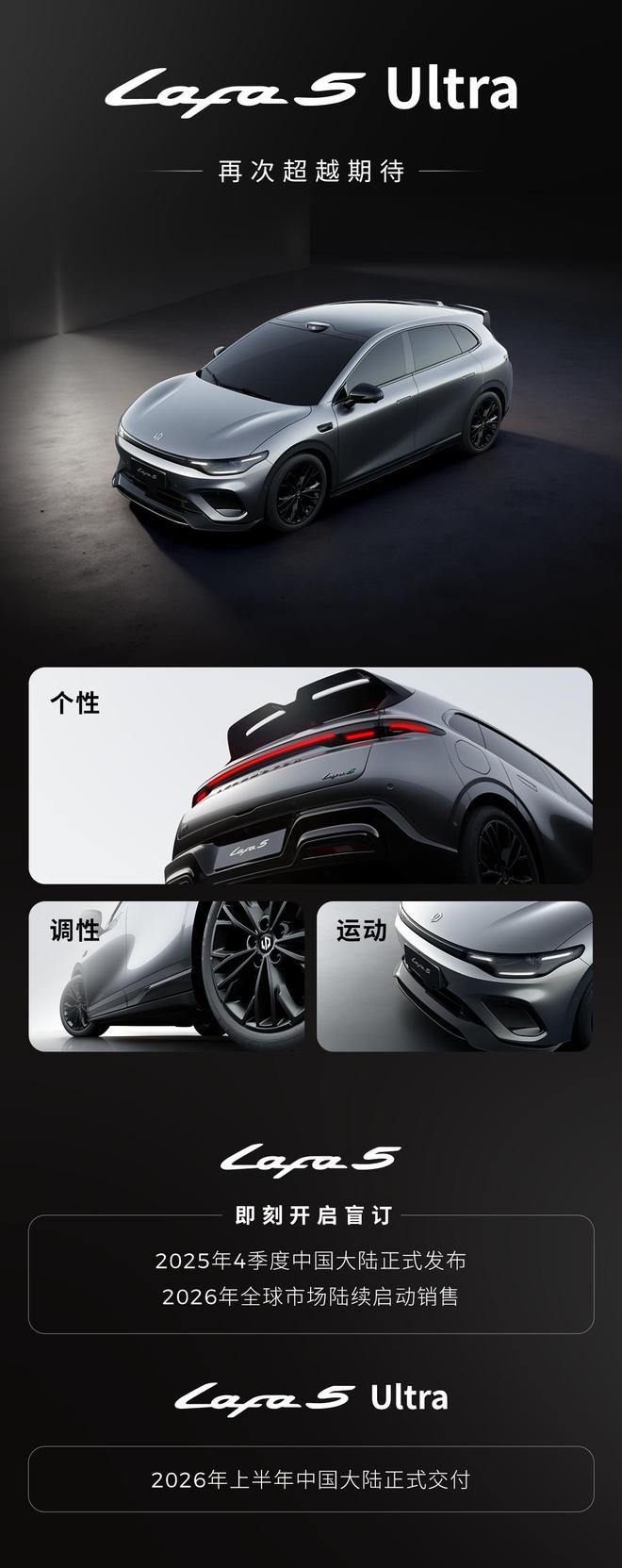 零跑 Lafa5基于全新 LEAP 3.5 技术架构打造,定位高颜值运动轿跑。官方表示,Lafa5将会成为都市青年的全新潮流符号。即刻开启盲订,将于今年第四季度在中国大陆正式发布,明年陆续进入全球市场。同时还将推出更运动的Lafa 5 Ultra,明年上半年在中国大陆交付。