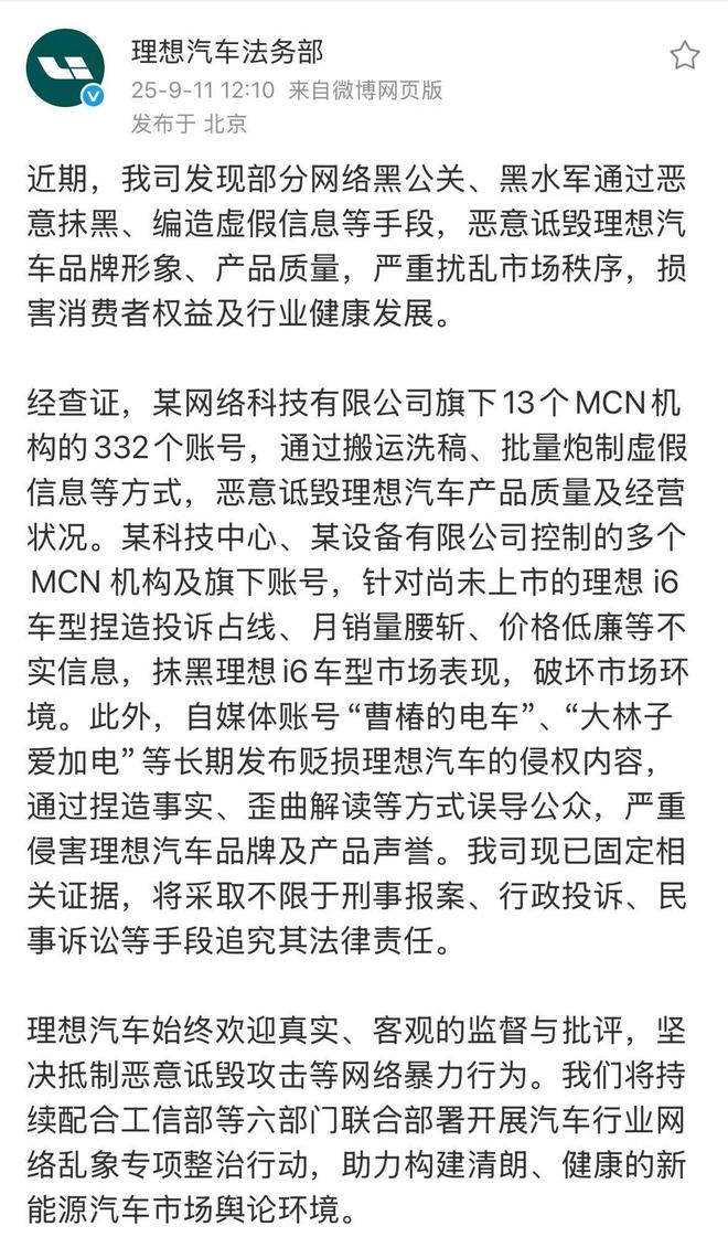 经查证,某网络科技有限公司旗下13个MCN机构的332个账号,通过搬运洗稿、批量炮制虚假信息等方式,恶意诋毁理想汽车产品质量及经营状况。某科技中心、某设备有限公司控制的多个MCN机构及旗下账号,针对尚未上市的理想i6车型捏造投诉占线、月销量腰斩、价格低廉等不实信息,抹黑理想i6车型市场表现,破坏市场环境。此外,自媒体账号“曹椿的电车”、“大林子爱加电”等长期发布贬损理想汽车的侵权内容,通过捏造事实、歪曲解读等方式误导公众,严重侵害理想汽车品牌及产品声誉。公司现已固定相关证据,将采取不限于刑事报案、行政投诉、民事诉讼等手段追究其法律责任。