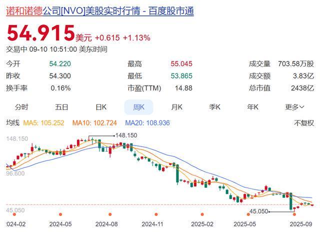 不过,由于来自全球市场竞争对手日益增长的压力,诺和诺德过去一年来股价下跌近60%,今年内跌超30%,目前市值仅剩2410亿美元,较一年前蒸发超3500亿美元(约合人民币2.5万亿元)。