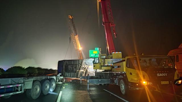 9月10日晚,豫南地区遭遇强降雨,高速公路通行安全面临严峻考验。23时20分,京港澳高速853公里路段突发险情,两辆重型货车因雨天路滑制动不及发生碰撞,其中一辆厢式重型货车侧翻,车身与散落货物占据全部行车道及应急车道,导致交通中断。
