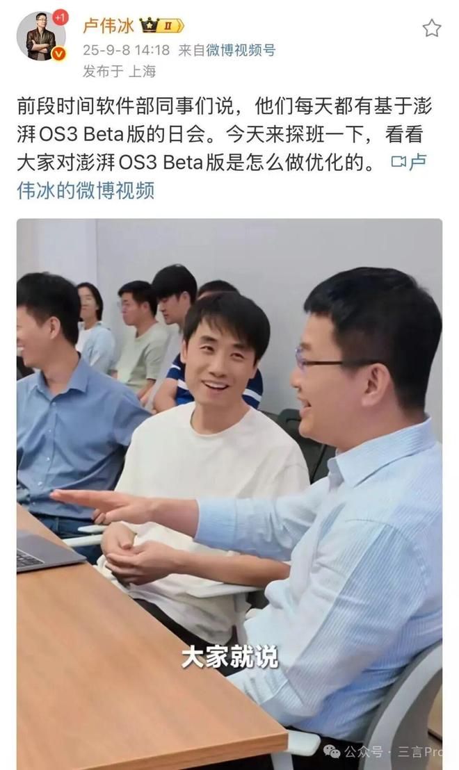 也可以看到卢伟冰已经在为新机做预热了,除了上面提到的发布会提档,卢伟冰还探班了澎湃OS3技术团队,预计该系统正式版将在小米16上首发。