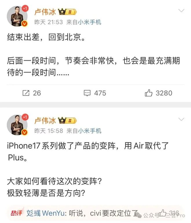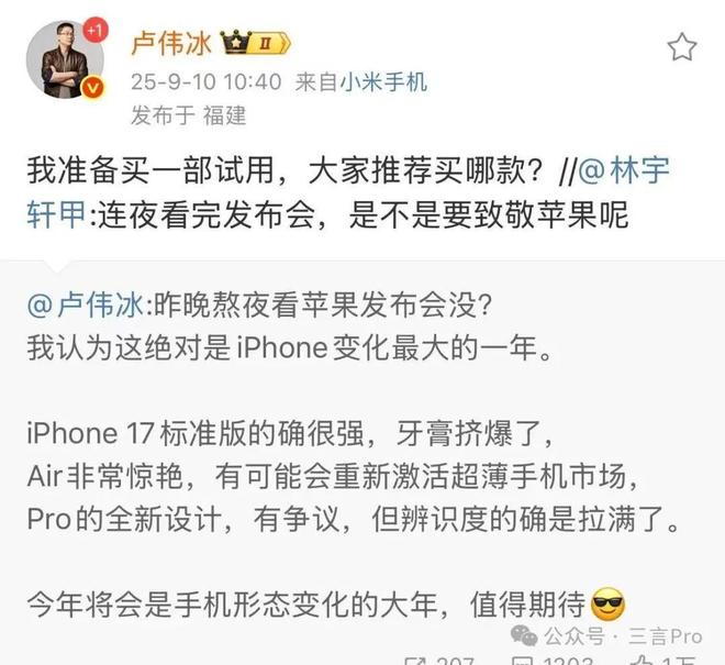 此外,卢伟冰最近发布了多条有关苹果iPhone17的微博。最近基本都是在谈手机相关的话题。