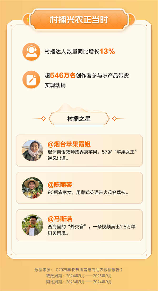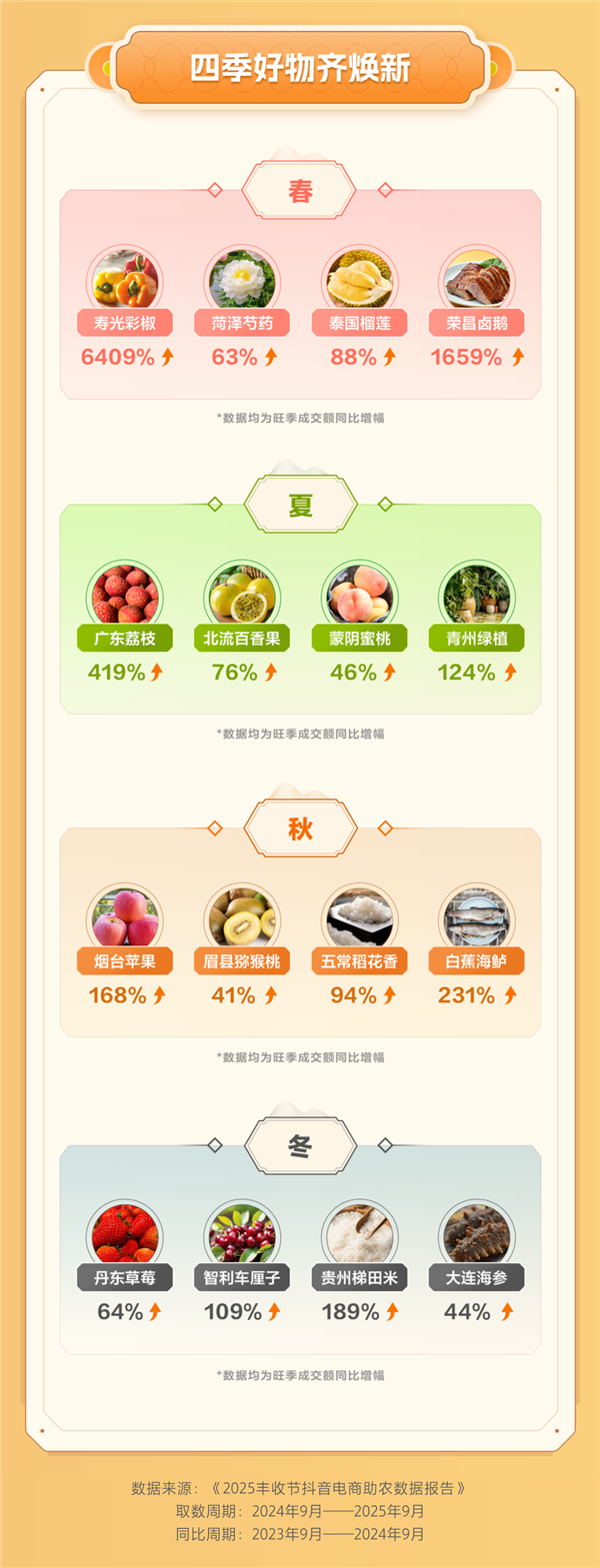 数据显示,2024年9月至2025年9月,平台累计销售农特产品102亿单,平均每天有2448万单农特产包裹发往全国各地。近三年累计销售农特产超200亿单,平均每天增长一万单,加速带动优质农特产品“出村进城”。全年农特产品店播商家数量同比增长51%,超546万名创作者带货农产品实现动销,越来越多农货商家选择通过抖音电商触达更广泛的消费者。
