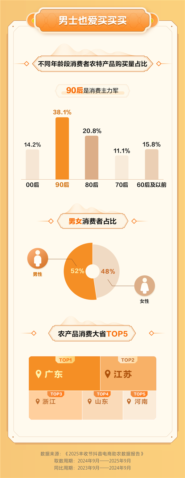 9月11日,抖音电商发布《2025丰收节抖音电商农产品消费白皮书》(下称“白皮书”),展现过去一年平台农特产品销售情况、大众消费趋势及农货商家经营情况。