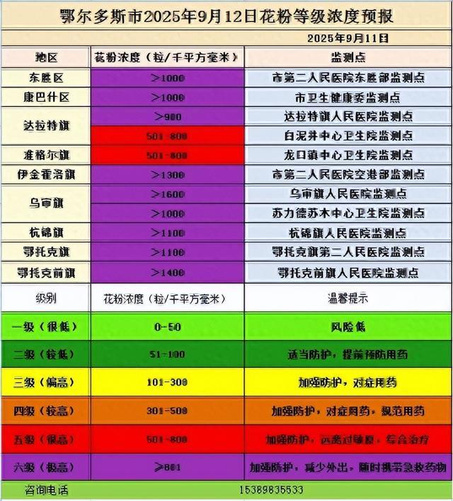 鄂尔多斯市9月12日花粉等级浓度预报。 图/鄂尔多斯市卫生健康委员会