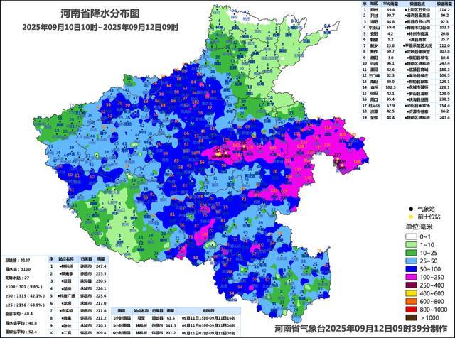 10日夜里至11日,我省大部出现大范围降水天气,中西部、东部、东南部出现暴雨,其中商丘、许昌、周口、驻马店等地出现大暴雨。全省平均降水量48.4毫米,地市平均降水量前三为商丘102.3毫米、许昌96.1毫米、周口95.4毫米。最大降水量为许昌市林科所247.4毫米,最大小时雨强为固始县马罡63.5毫米(9月11日15时至16时)。