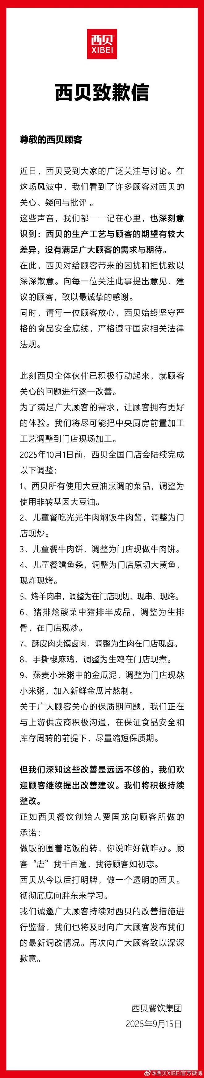 西贝餐饮近日就食品安全问题正式道歉,并承诺调整中央厨房与门店现加工的平衡,针对消费者的担忧,西贝表示将重视并采取切实措施,确保食品质量和安全,公司将更加注重门店现场加工的比例,以确保食材的新鲜和口感,此次调整旨在回应公众关切,并持续提升消费者的用餐体验,西贝强调将始终秉持诚信经营的原则,为消费者提供安全、健康的餐饮服务。