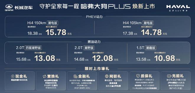 9月15日报道 日前,哈弗大狗PLUS于保定正式上市,新车定位家庭泛越野中型SUV,提供黄金甲、绿鳞甲、白光甲、凌灰甲及玄黑甲五种车身颜色及云锦米、乌木黑两种内饰颜色。动力方面则有纯燃油和PHEV车型可选。新车共推出5款车型,售价13.58-18.38万元。现在下定可享受官方1.8万元现金优惠及8000元置换补贴,补贴后价格为10.98-15.78万元。并有多重购车优惠政策。