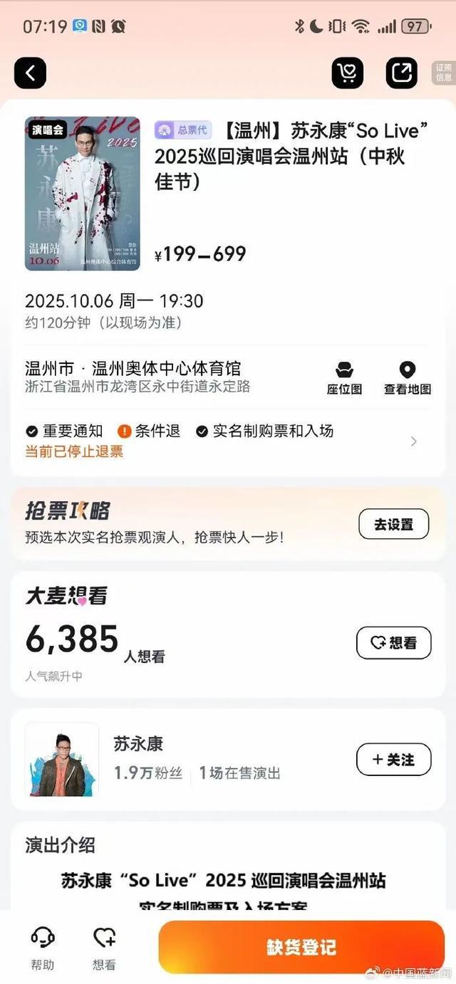 此前平台显示,苏永康“So Live”2025巡回演唱会温州站(中秋佳节)将于10月6日在温州奥体中心体育馆举办,票价为199元至699元不等,所有门票已经售罄。