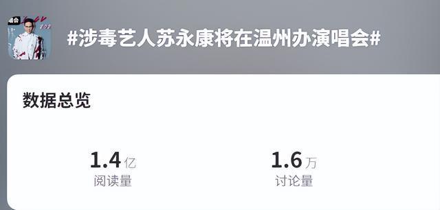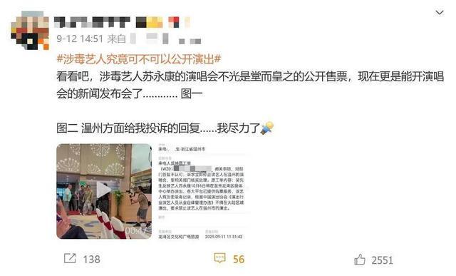 近日,艺人苏永康将于10月初在浙江温州举办演唱会,因其曾有涉毒历史,有网友向温州当地相关部门进行投诉。