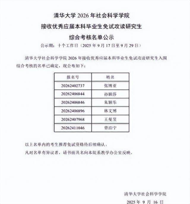 9月16日,清华大学社会科学学院对接收优秀应届本科毕业生免试攻读研究生综合考核名单进行公示,中国乒乓球队运动员孙颖莎、王曼昱榜上有名。