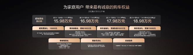 新车同时公布多项购车政策,10月31日前完成购车可享10000元置换补贴。同时,比亚迪还为用户准备了包含置换补贴在内的至高价值4.3万元礼遇。
