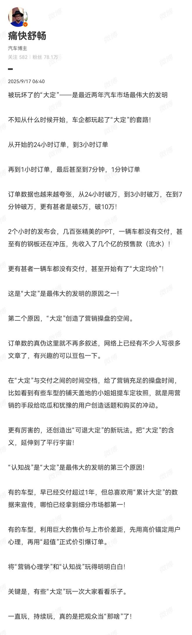 在“大定”与交付之间的时间空档,营销操盘时间充足。博主提到,有些车型的铺天盖地的提车定妆照,是用营销手段给吃瓜和犹豫的用户创造话题和购买冲动。博主直言,如今的“大定”将“营销心理学”和“认知战”玩得明明白白,把观众当“那啥”了。