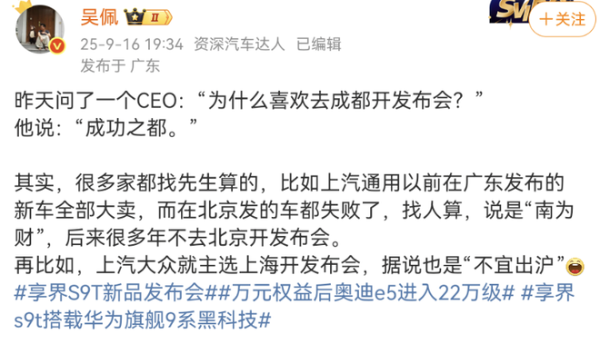 9月16日,汽车博主吴佩在微博爆料车企选择发布会地点的行业内幕。他表示,很多车企会找先生算发布会地点。针对为何喜欢去成都开发布会的问题,某位CEO称成都为“成功之都”。