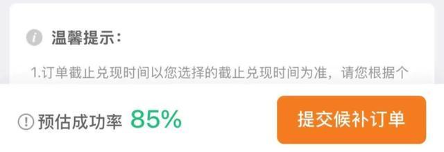 5.支持查看当前候补订单的预估成功率,预估成功率按照历史候补订单兑现情况测算,仅供参考。