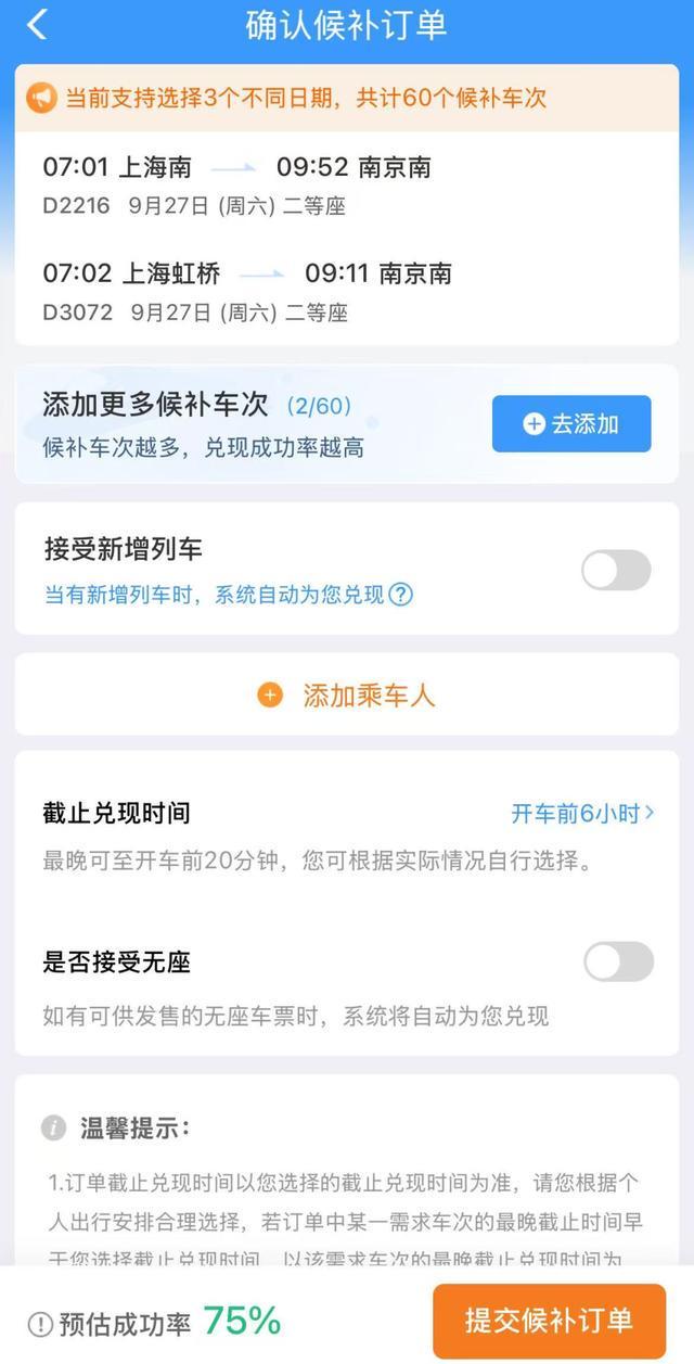 2.支持添加更多候补车次。每个用户同时可以保有6个待兑现候补订单;每个候补订单最多可选择3个乘车日期,总计添加不超过60个车次;最多可添加9位乘车人;候补订单截止兑现时间为不晚于开车前20分钟。