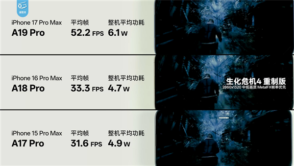 《生化危机4:重制版》:A19 Pro达到了52.2FPS(6.1W),比A18 Pro(4.7W)的33.3FPS高出56%,比A17 Pro(4.9W)的31.6FPS高出65%。