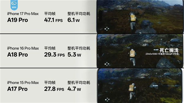 《死亡搁浅》:A19 Pro达到了47.1FPS(6.1W),比A18 Pro(5.3W)的29.3FPS高出60%,比A17 Pro(4.7W)的27.8FPS高出69%。