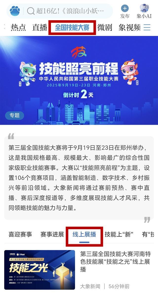 路径2:下载并打开大象新闻客户端 - 点击导航栏“全国技能大赛”专题 - 点击“线上展播”进入展播专区