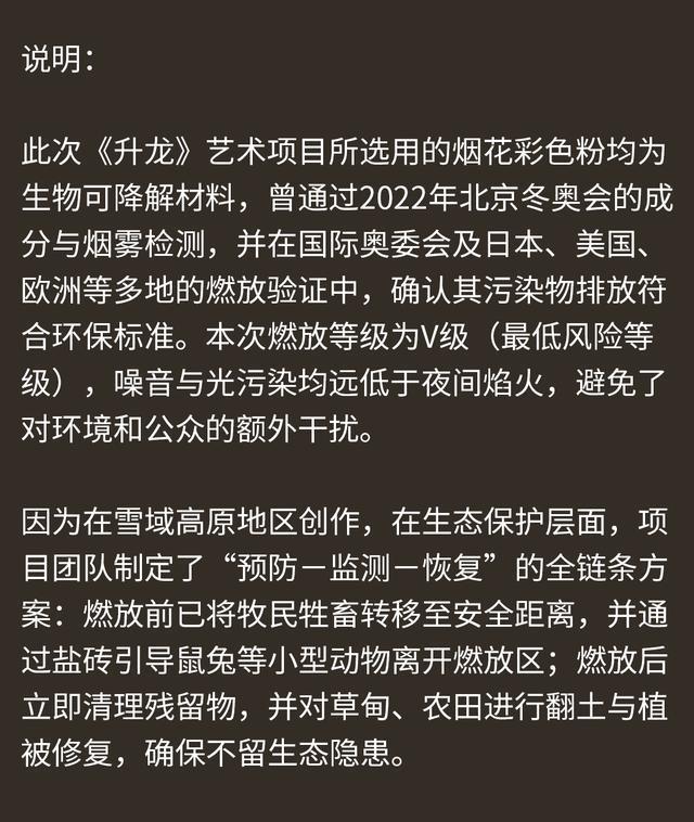 主办方称,此次《升龙》艺术项目所选用的烟花彩色粉均为生物可降解材料,并在国际奥委会及日本、美国、欧洲等多地的燃放验证中,确认其污染物排放符合环保标准。本次燃放等级为V级(最低风险等级),噪音与光污染均远低于夜间焰火,避免了对环境和公众的额外干扰。