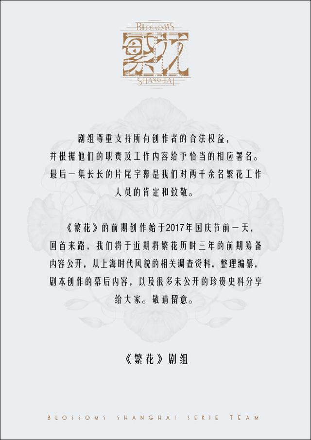 9月20日下午,电视剧《繁花》官方微博发文回应编剧署名权争议:“剧组支持所有创作者的合法权益,并根据职责和工作内容给予相应署名,最后一集长长的片尾字幕,是对两千余名工作人员的肯定和致敬”,呼吁大家敬请留意。