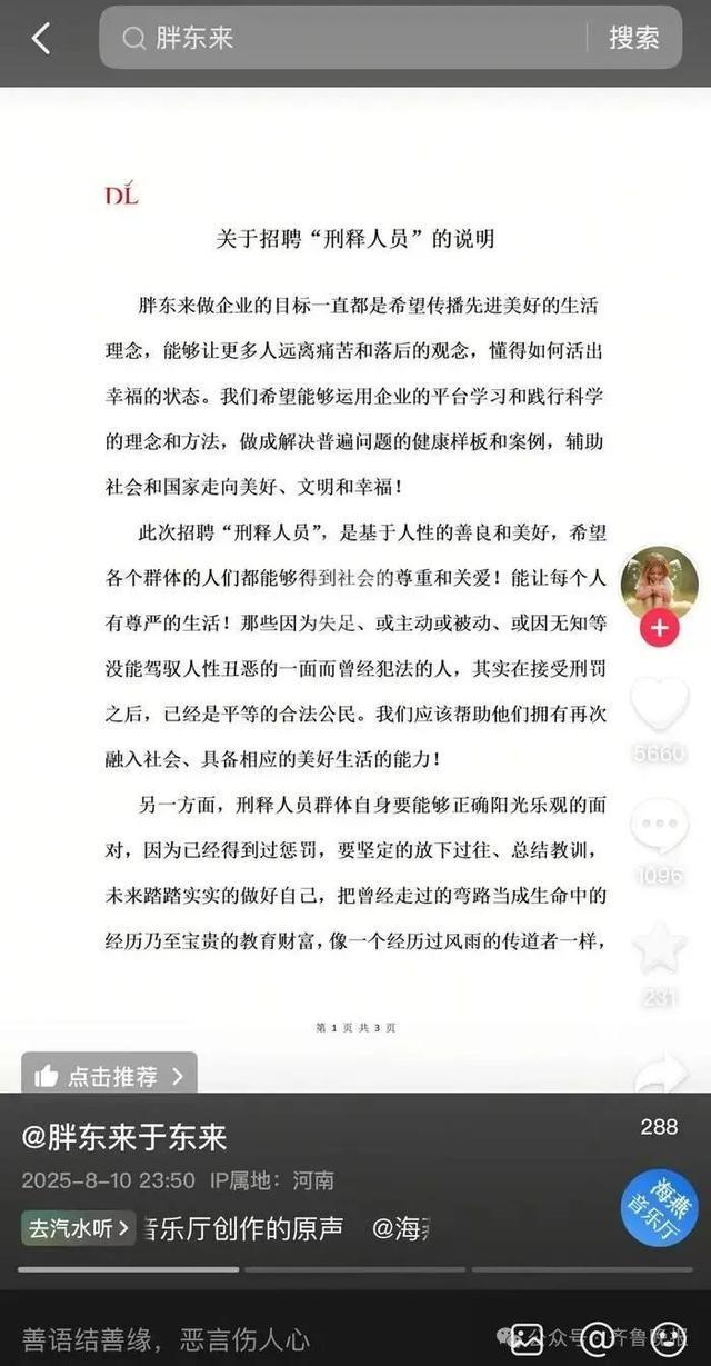 这是胖东来首次公开招聘刑释人员,受到广泛关注。