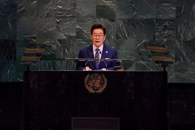李在明当地时间9月23日在纽约联合国大会上发表讲话。图源:韩媒